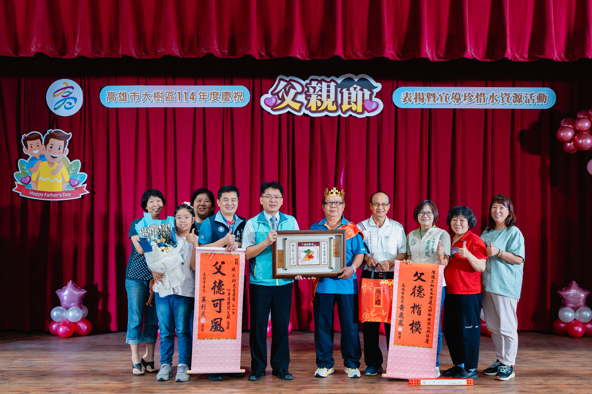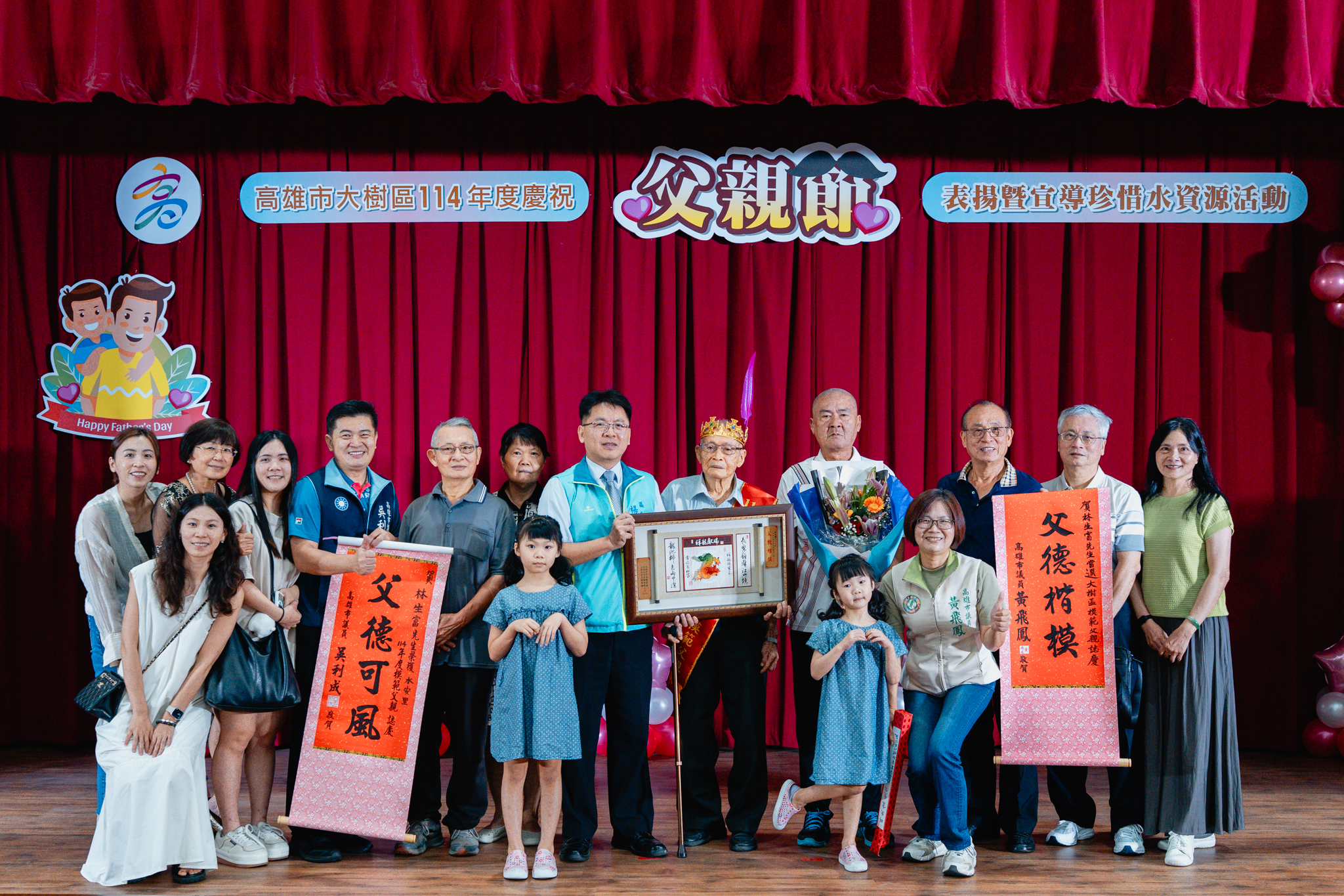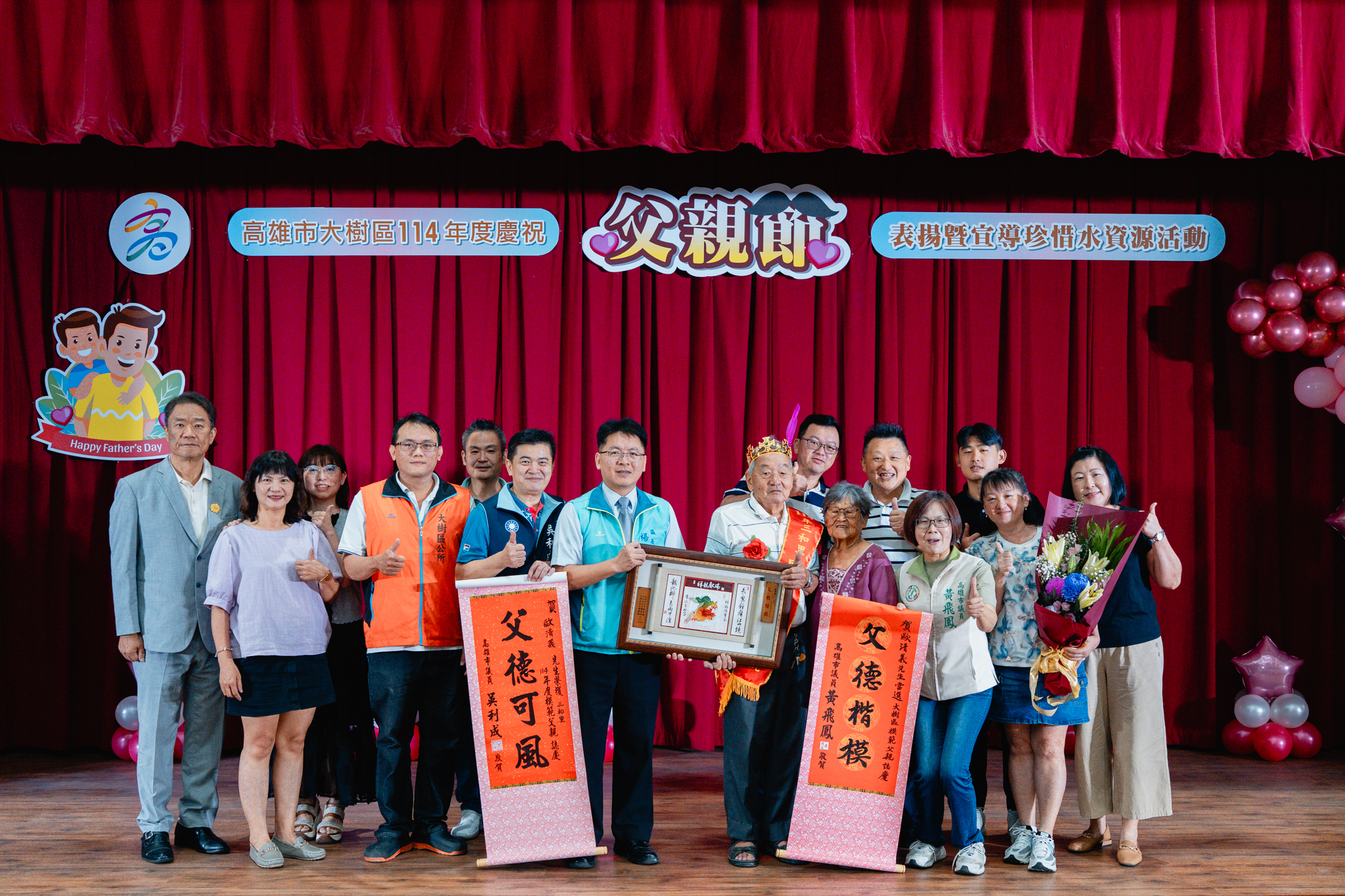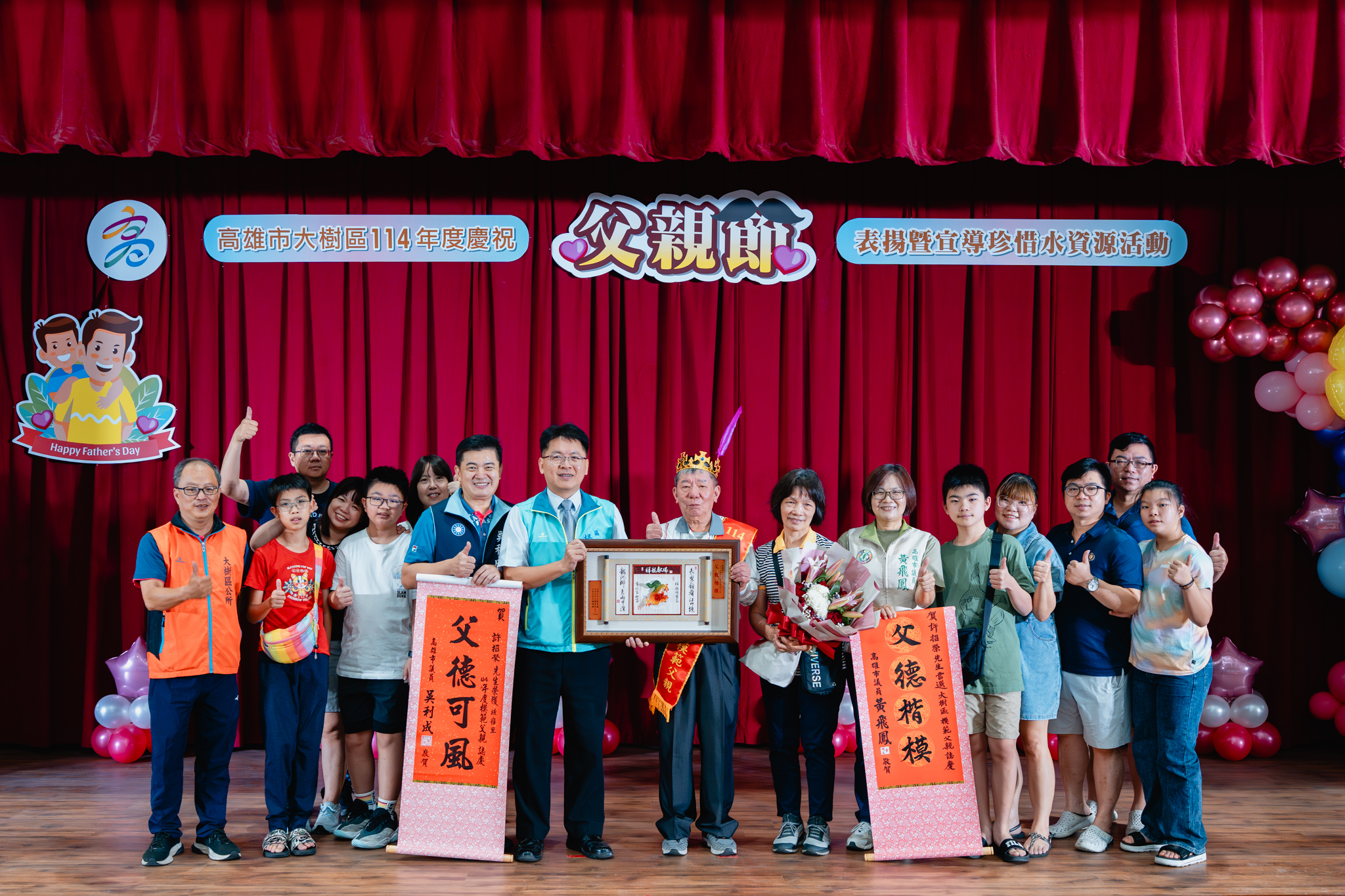 為了感謝父親們長期以來無私奉獻,並彰顯父愛的重要性,大樹區公所於今(2)日在公所3樓禮堂舉辦114年度模範父親表揚活動,區長楊明融特別頒發獎牌表揚,感謝區內18名模範父親對於家庭、社會辛勞和偉大的付出。立委許智傑、立委賴瑞隆、立委邱議瑩服務團隊、立委林岱樺服務團隊、市議員黃飛鳳、市議員吳利成、市議員江瑞鴻、市議員張勝富、市議員邱俊憲服務團隊及本區里長共同蒞臨觀禮,每個受獎家庭成員也都紛紛上台一同祝賀,場面十分溫馨感人。