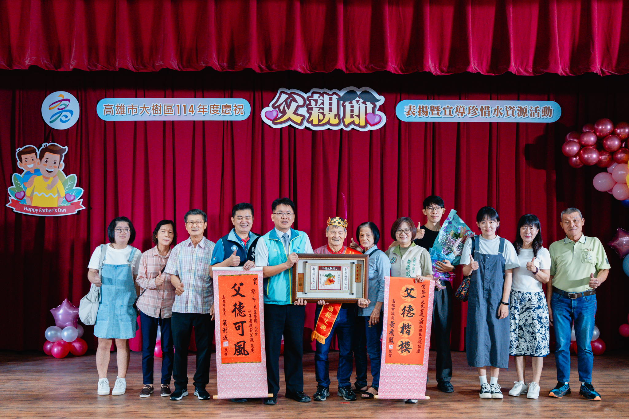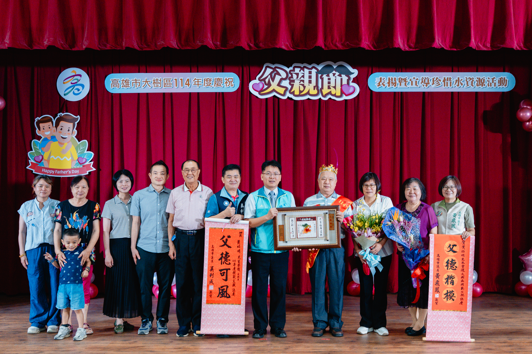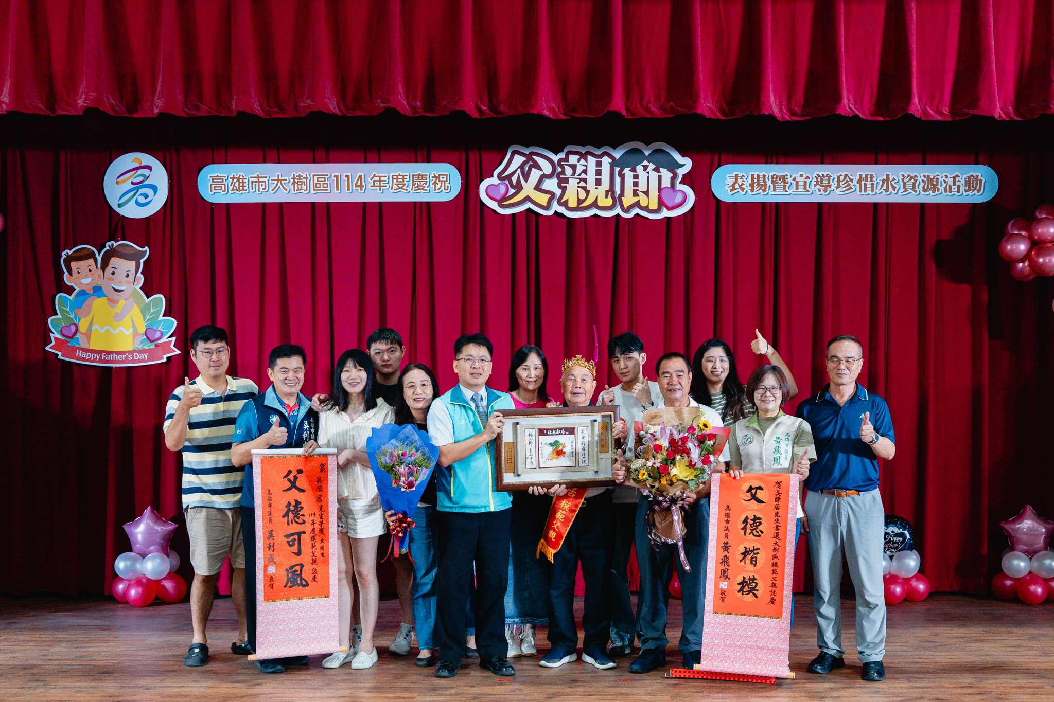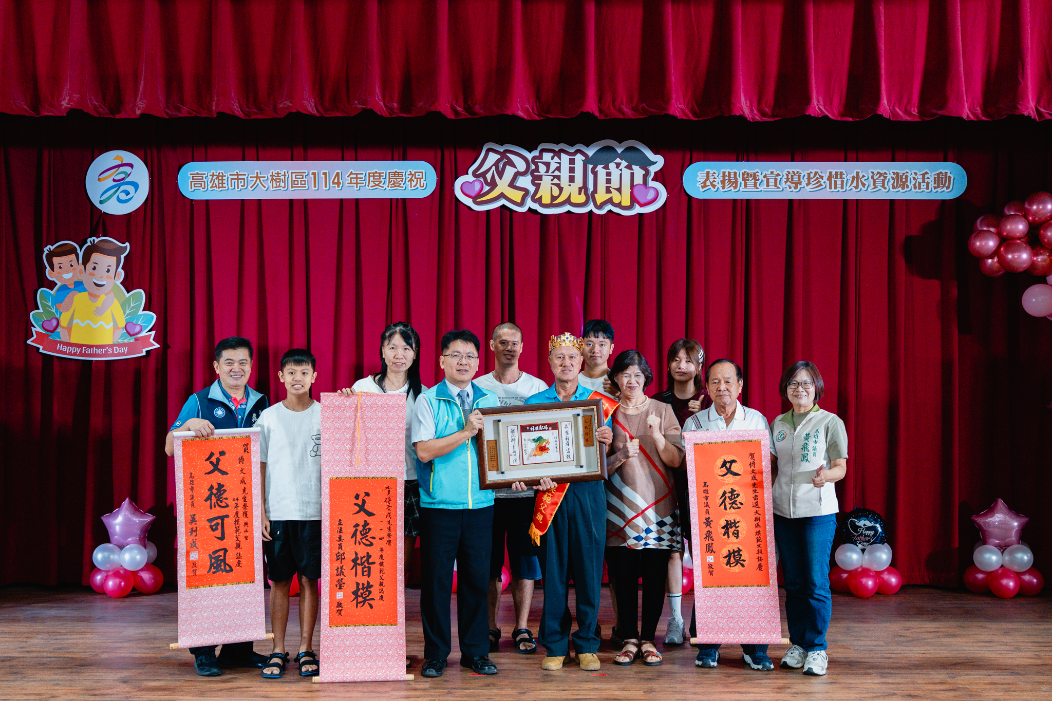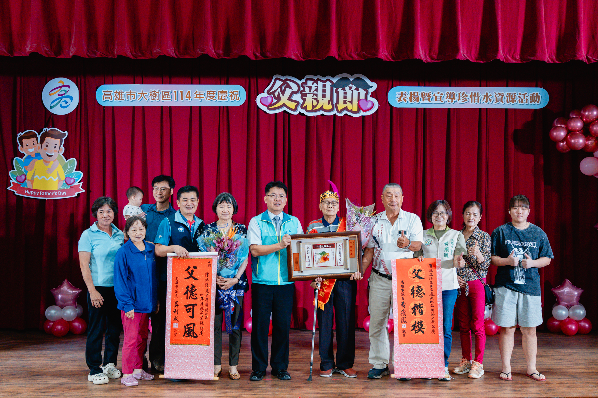 為了感謝父親們長期以來無私奉獻,並彰顯父愛的重要性,大樹區公所於今(2)日在公所3樓禮堂舉辦114年度模範父親表揚活動,區長楊明融特別頒發獎牌表揚,感謝區內18名模範父親對於家庭、社會辛勞和偉大的付出。立委許智傑、立委賴瑞隆、立委邱議瑩服務團隊、立委林岱樺服務團隊、市議員黃飛鳳、市議員吳利成、市議員江瑞鴻、市議員張勝富、市議員邱俊憲服務團隊及本區里長共同蒞臨觀禮,每個受獎家庭成員也都紛紛上台一同祝賀,場面十分溫馨感人。