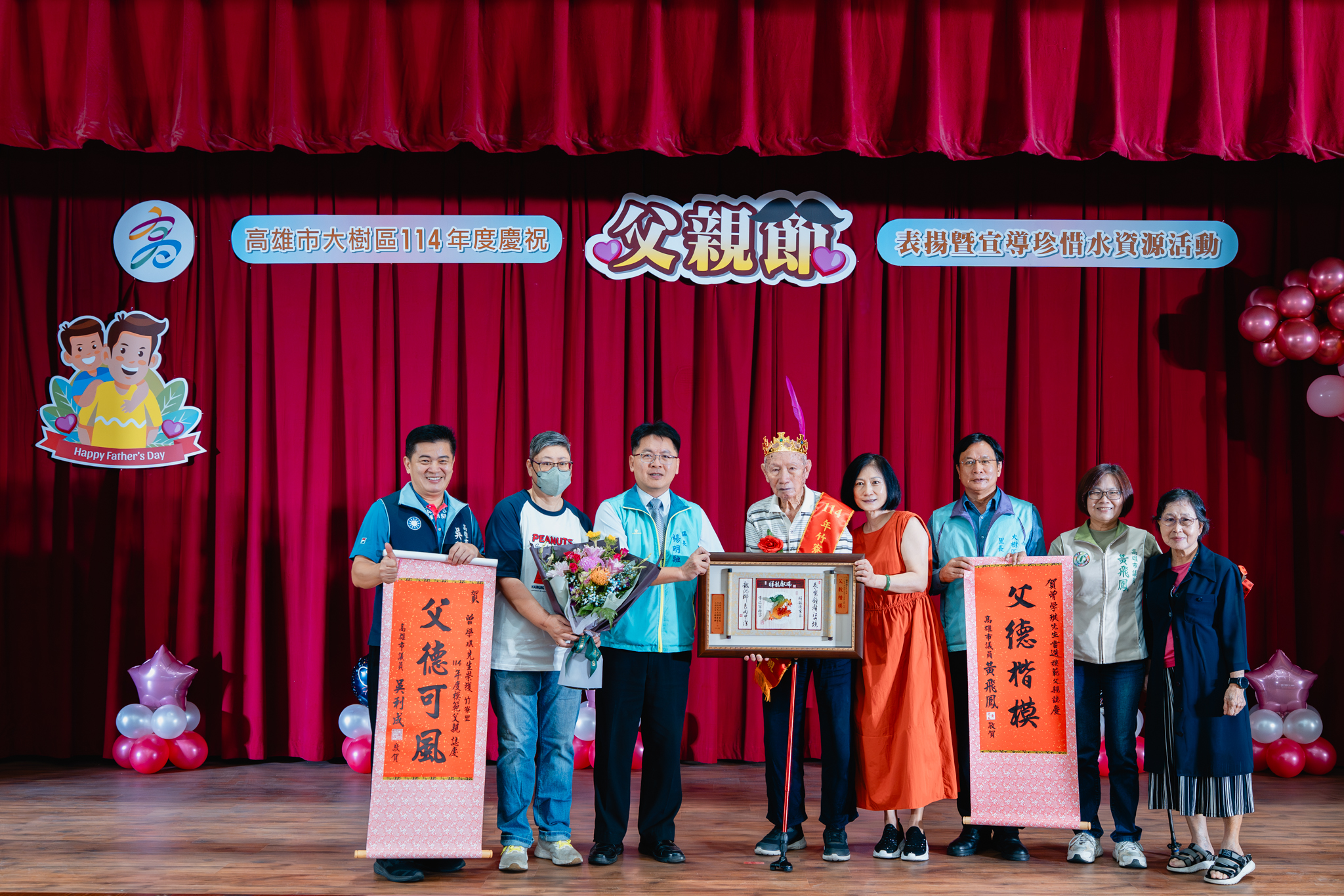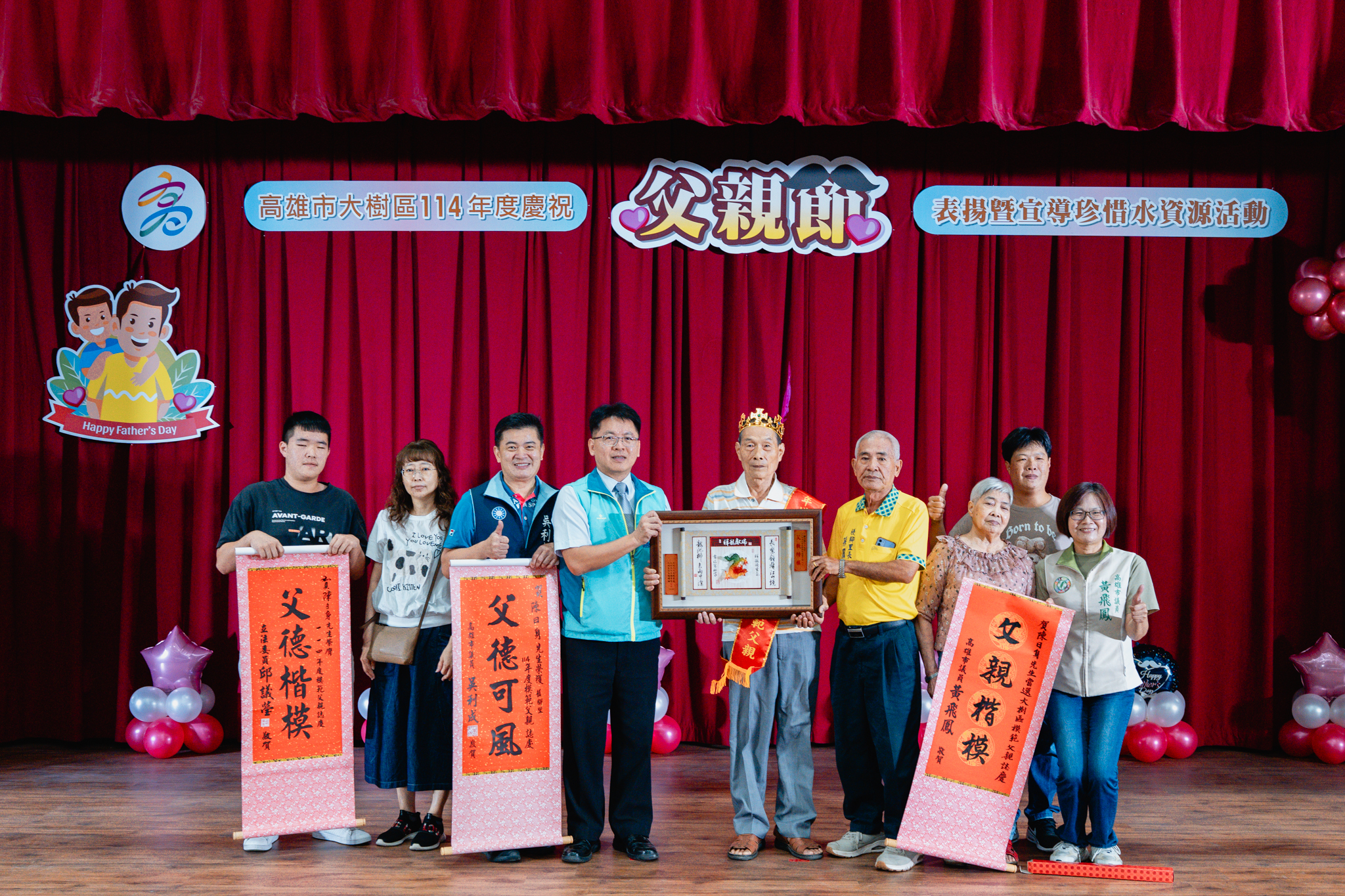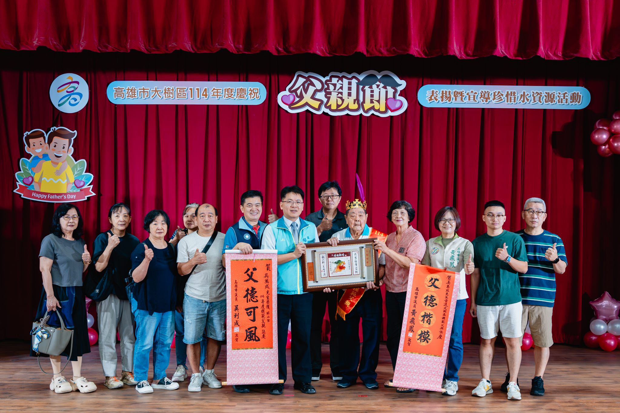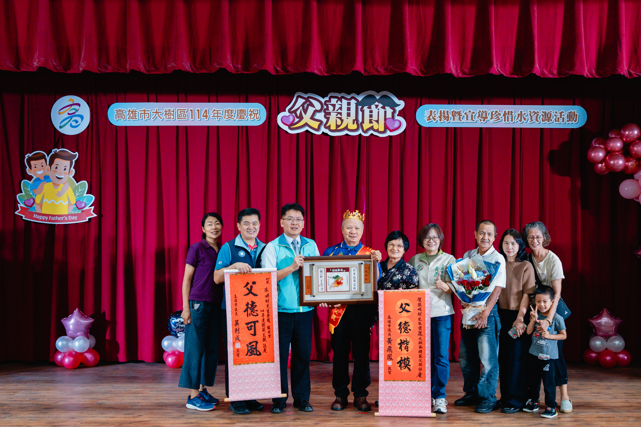 為了感謝父親們長期以來無私奉獻,並彰顯父愛的重要性,大樹區公所於今(2)日在公所3樓禮堂舉辦114年度模範父親表揚活動,區長楊明融特別頒發獎牌表揚,感謝區內18名模範父親對於家庭、社會辛勞和偉大的付出。立委許智傑、立委賴瑞隆、立委邱議瑩服務團隊、立委林岱樺服務團隊、市議員黃飛鳳、市議員吳利成、市議員江瑞鴻、市議員張勝富、市議員邱俊憲服務團隊及本區里長共同蒞臨觀禮,每個受獎家庭成員也都紛紛上台一同祝賀,場面十分溫馨感人。